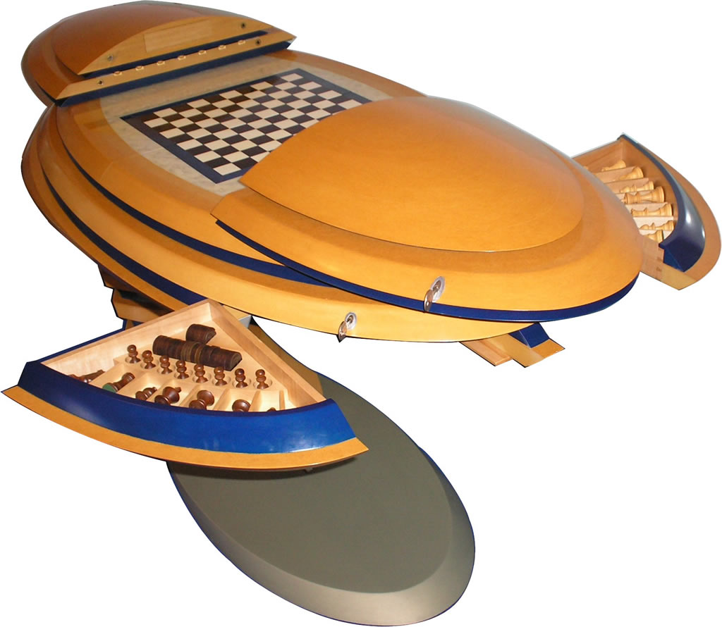 Les pions de dames et les pièces d’échecs sont dissimulés dans des tiroirs sous la table avec une ouverture par parallélogrammes.
