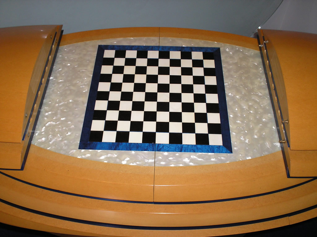 2ème strate : Jeu d’échecs et de dames, réalisé en ébène du Gabon et os de bovin, agrémenté par une frise en érable moucheté teinté bleu. L’entourage en nacre synthétique évoque l’intérieur de l’huitre.