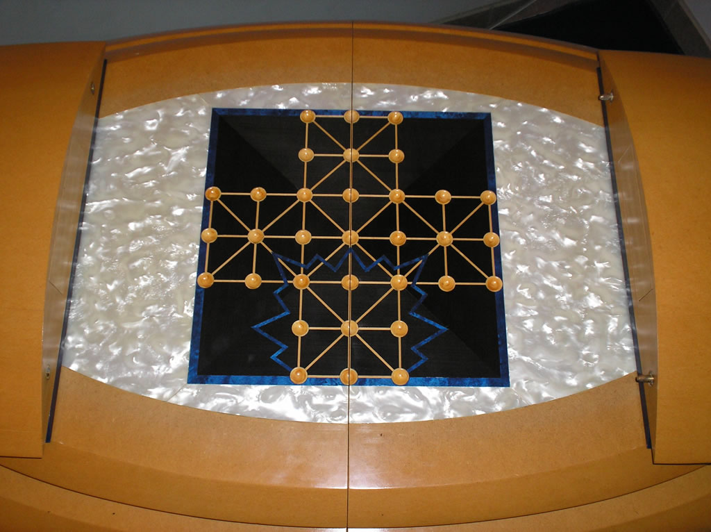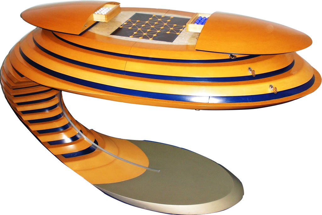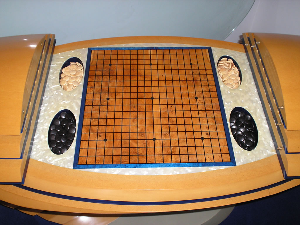 3ème strate : Jeu de Go d’origine Chinoise, réalisé sur un fond en loupe d’If avec incrustation de filets d’ébène, agrémenté par une frise en érable moucheté teinté bleu. L’entourage en nacre synthétique évoque l’intérieur de l’huitre.